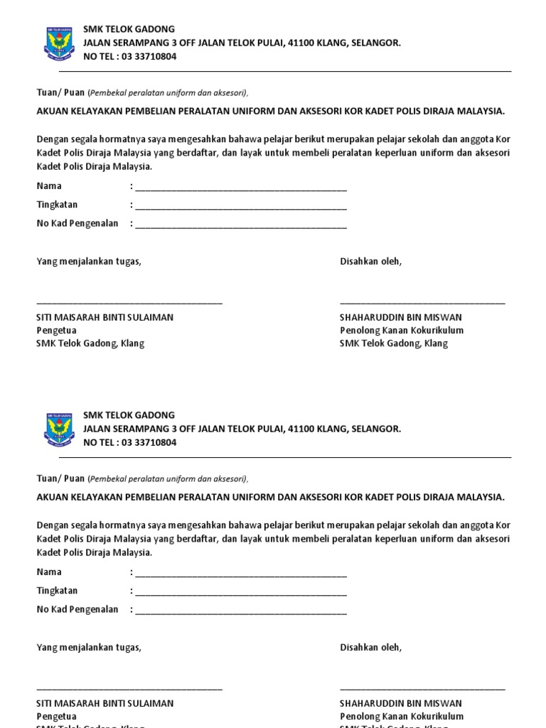 Surat makluman merentas desa ibubapa. Polis, revista de la universidad bolivariana, volumen 9, nº 26, 2010. Demikian surat permohonan pembatalan polis asuransi ini dibuat, atas kebijaksanaannya diucapkan terima kasih. Anda juga boleh download borang ini melalui pautan di bawah bagi pekerja yang perlu merentas daerah, mereka perlu hanya menunjukkan pas kerja atau surat kebenaran daripada majikan. Kontynuując przeglądanie stron serwisu pkp.pl wyrażasz zgodę na używanie plików cookies. Surat jemputan by farah80wahida 7435 views. Aby dowiedzieć się więcej, zapoznaj się z naszą polityką prywatności. Tangerang, 20 oktober 2017 m. Taryfa towarowa pkp cargo s.a. Formulir surat pemberitahuan objek pajak (spop) dan lampiran spop. Contoh surat kepada balai polis terdekat untuk langkah keselamatan sepanjang program berlangsung. Download as docx, pdf, txt or read online from scribd. Mahasiswa di sekolah tempat mengajar terkait dengan tugas pkp yg harus dikerjakan 2.